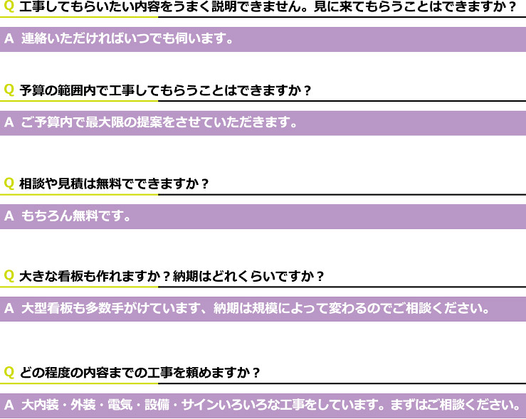 釧路市の看板屋「ViSET」がお客様からいただくお問い合わせのうち、多数寄せられるご質問についてQ&A方式でご紹介いたします。ご質問の中で特に多いのは料金と看板のデザインについてです。料金については、ご契約前に明確なお見積もりをご提示いたしますので、ご不明な点がありましたらお気軽にお訪ねください。
